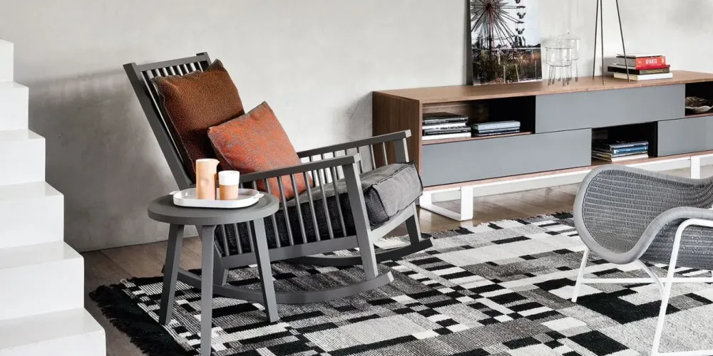Dal design di Paola Navone, Gray 09 è una poltrona a dondolo con struttura in legno, noce o rovere, e cuscini imbottiti. Il donodolo è personalizzabile sia nella struttura che nel rivestimento: le finiture legno disponibili sono noce Canaletto verniciato naturale, rovere sbiancato o rovere laccato bianco, grigio, avio o nero. Sono presenti poi un cuscino di seduta e due cuscini volanti: uno 65×80, uno 65×50 cm che possono essere rivestiti in diversi tessuti, tutti sfoderabili. Il prezzo si intende per i rivestimenti in TESSUTO CAT B (Natural Lino Bianco e Tela Kronos, Dama, Furby, Lume), è possibile scegliere tessuti diversi per i diversi cuscini ed inserire il profilo in contrasto.