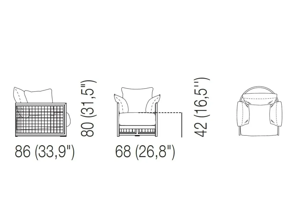 Cuscino di seduta in poliuretano espanso a densità differenziata, con rivestimento esterno in misto piuma d’oca e fibra di poliestere.