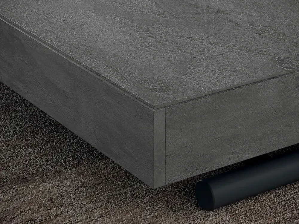Il tavolino ha una lunghezza 120 cm, New Cover si convertire rapidamente in un tavolo da pranzo lungo 220 cm, pronto per ospitare fino a 10 persone. New Cover ha una base in metallo verniciato grafite opaco oppure bronzo mentre il pratico piano in eco legno, disponibile in diverse finiture. Il pianale è disponibile in tre effetti legno e tre nell’attuale finitura spatolata.