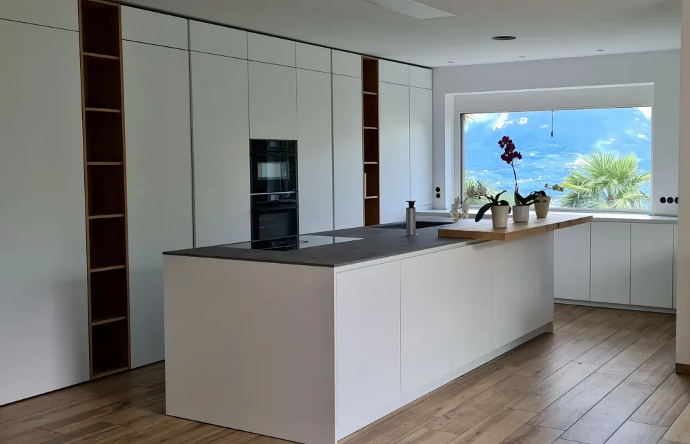 Nell’isola troviamo la zona operativa che comprende il piano cottura a induzione con cappa integrata ed il lavello monovasca sottotop in fragranite.