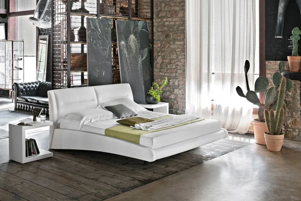Letto matrimoniale imbottito rivestito in morbido soft-touch che simula l’effetto sospeso. Predisposto per reti di misura 160×200.