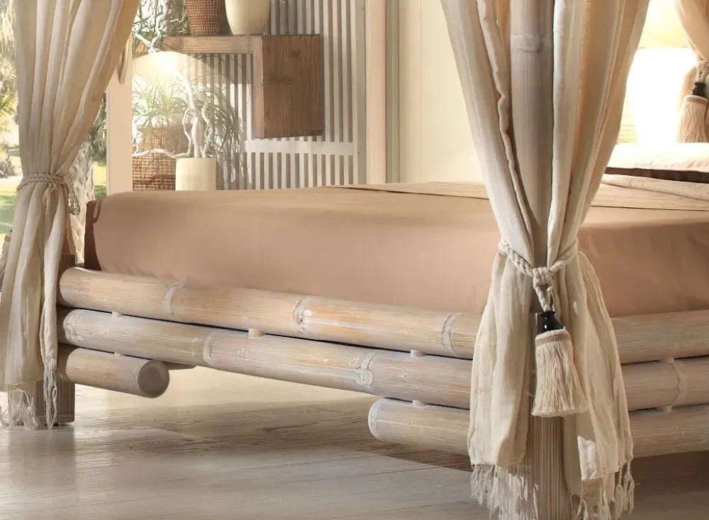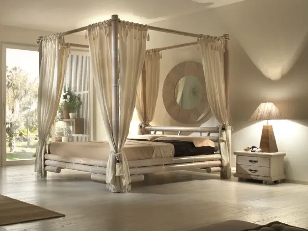 Il Letto Etnico a Baldacchino Tabanan, richiama con eleganza atmosfere esotiche e calde. Prodotto di alta qualità realizzato artigianalmente, la struttura è in legno massello di acacia, con preziosi particolari in bambù e crash bambù (bambù lavorato e pressato). Disponibile in due colori: decapato bianco (come in foto) oppure miele anticato. Misure letto: 183×242 h40/223 – misure rete a doghe in legno di bambù: 160×200
