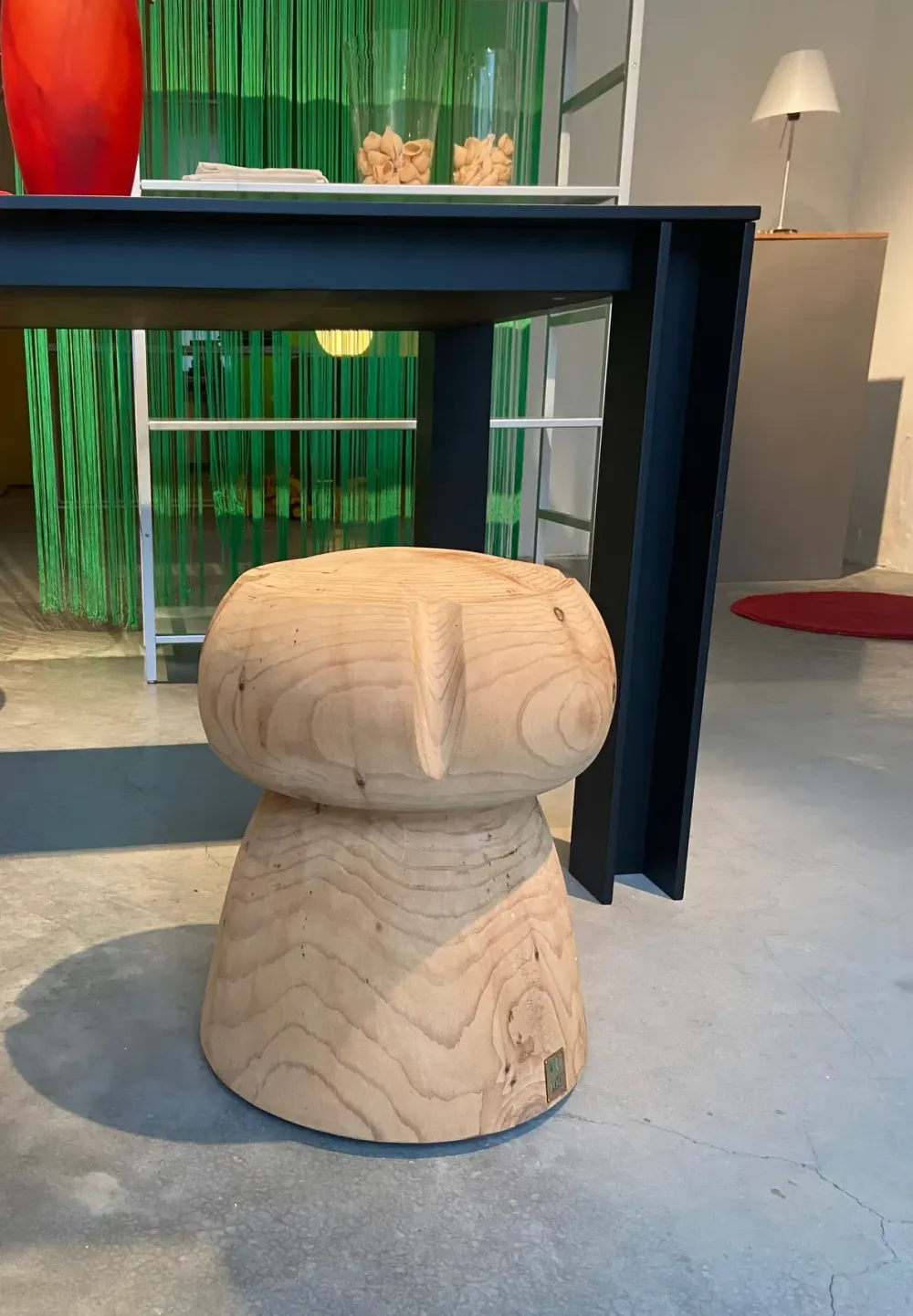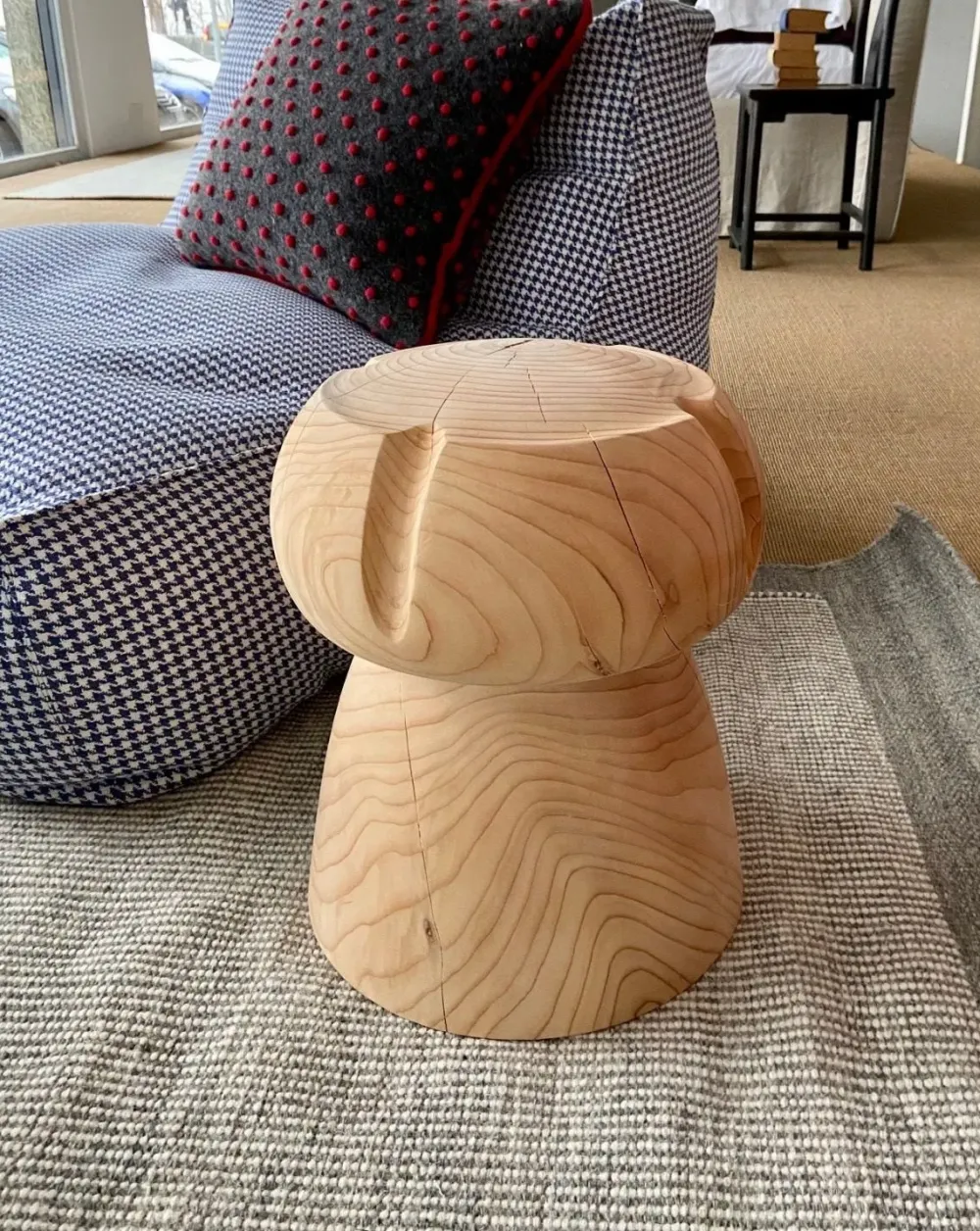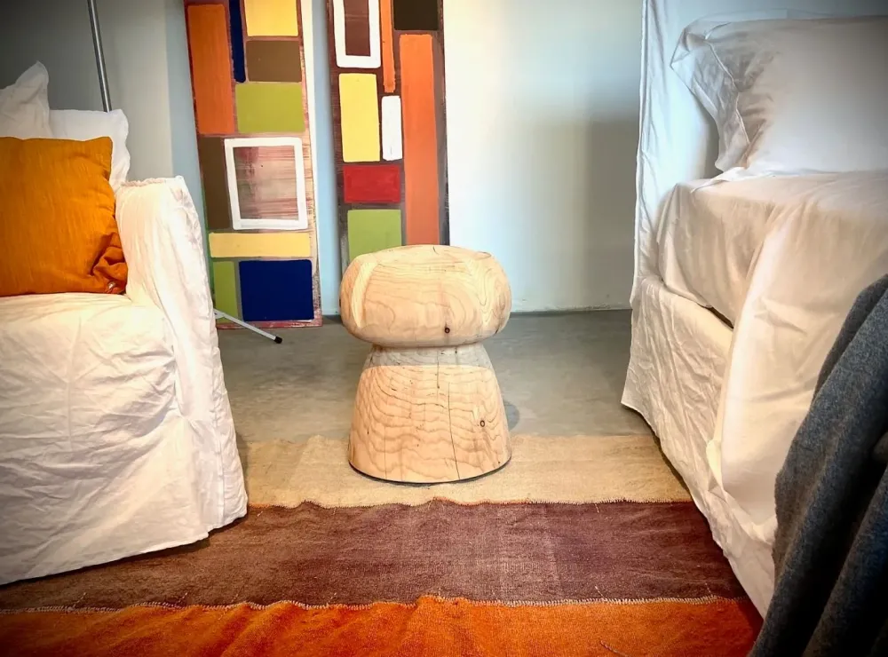 Sgabello in legno massello di cedro profumato lavorato da un blocco unico, rievocazione di un maxi tappo tipico delle bottiglie di Champagne.