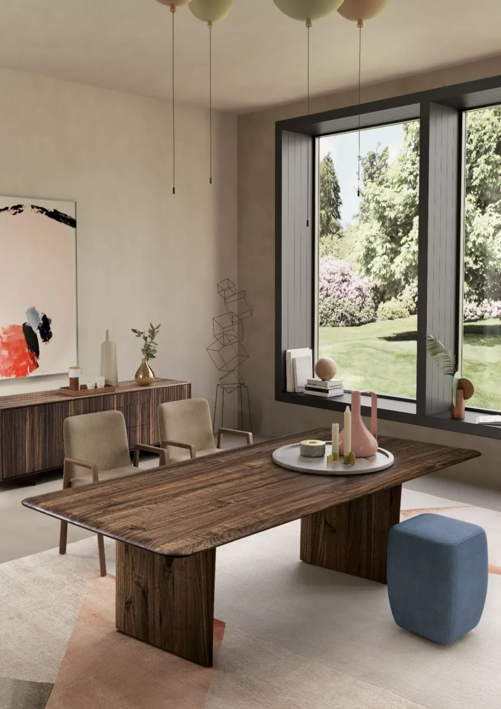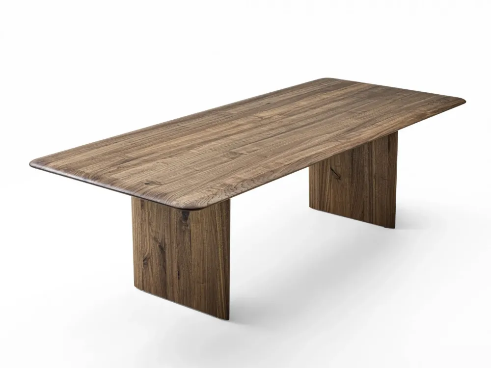 Tavolo in noce finitura olio, dimensioni L 240 P 100 H75 cm, interamente realizzato in legno massello a liste incollate con lati stondati, si caratterizza per top e gambe con spessori assottigliati tramite lavorazione a saponetta, che ne dona leggerezza e sinuosità.