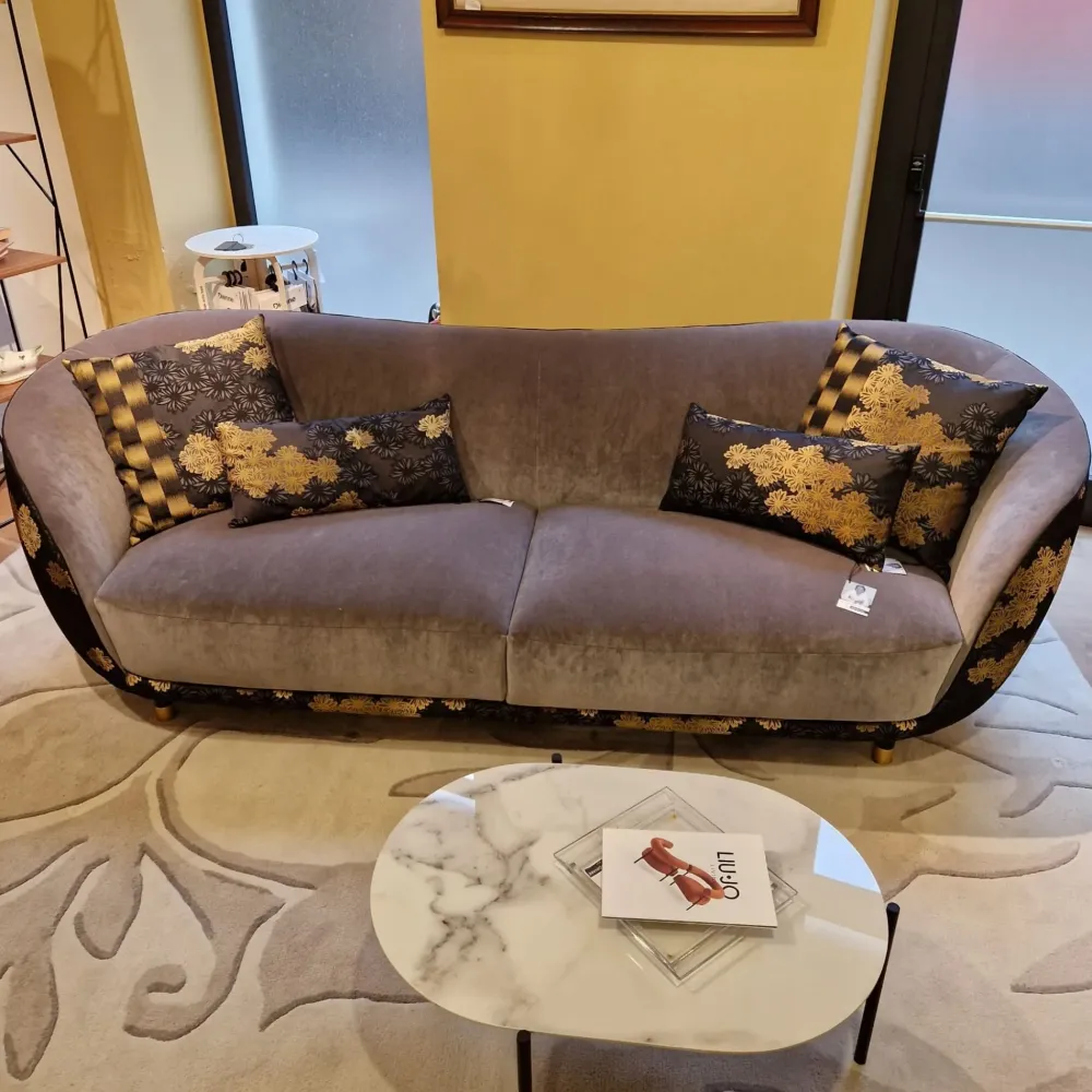 Divano 3 posti Maxi di cm 240L x 76H x 95P rivestito in tessuto Kenzo Takada esterno e velluto interno. Una tipica forma a cesto che riprende i codici cari agli anni Venti e li attualizza, con lo schienale rivestito da un tessuto interamente ricamato con fiori dorati in contrasto con il sobrio grigio della sua seduta. La finitura bicolore oro/grigio scuro dei suoi piedini in metallo molto discreta gli conferisce un tocco Decorator molto deciso. Design Antoine Fritsch & Vivien Durisotti.
