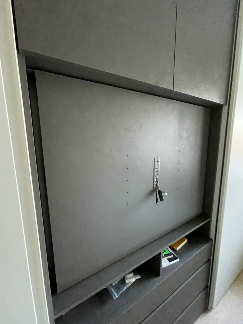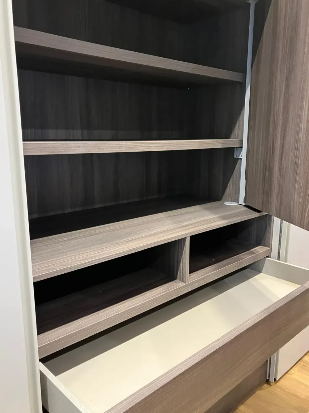 L’armadio è diviso in tre vani da cm 120 e lo spazio centrale è costruito per poter ospitare il TV dietro al quale si nasconde uno spazio con ripiani- La cassettiera a 3 cassetti, due piccoli spazi a giorno ed un ulteriore vano con ripiano sopra il TV ne definiscono la parte centrale mentre i due spazi laterali hanno l’anta scorrevole e sono attrezzati per tubo appendiabiti ed un ripiano interno-