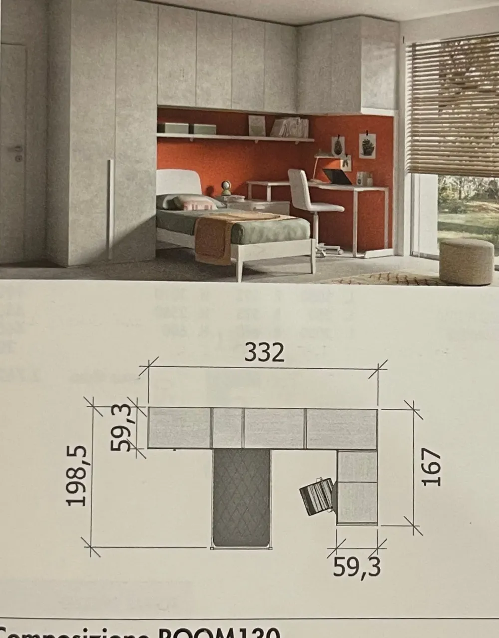 Camera Mottes Mobili con armadiatura a ponte angolare ad ante battenti, comodino a tre cassetti e scrivania con mensole porta oggetti. Il piano scrittoio sagomato con gamba quadra verniciata Bianca è disponibile in tutti i colori. Il contrasto delle finiture Graphic e Ghiaccio con il colore acceso Papaya rende unica e allegra la camera. Il prezzo è di Euro 3.100, 00iva e consegna compresa. Si possono modificare i colori senza variazione di prezzo! Per qualsiasi informazione contattateci in privato!