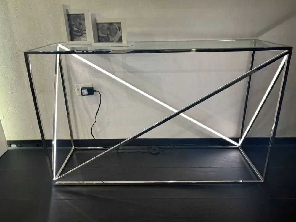 Per questa consolle Consolle illuminata è disponibile un piano in vetro, adatto per completare dal punto di vista estetico interni di qualsiasi stile assicurandoti contemporaneamente una buona resistenza nel tempo. I tuoi interni devono essere organizzati con una certa logica, affinchè i mobili e oggetti accessori ottimizzino lo spazio arricchendone l’estetica: perciò la scelta è spesso difficoltosa e si rischia di dover rinunciare all’aspetto estetico piuttosto che pratico; se vuoi un complemento moderna, questa consolle Consolle illuminata fa al caso tuo. Quando gli edifici abitativi impegnano spazi ristretti, è bene scegliere i mobili a seconda di conformazione e dimensione degli ambienti al fine di organizzare al meglio lo spazio; è imprescindibile dunque valutare altresì quale tipologia di consolle sia l’ideale: se desideri un complemento che ti consenta di avere sempre un posto in più per ogni possibile ospite, la consolle fissa Consolle illuminata fa al caso tuo!