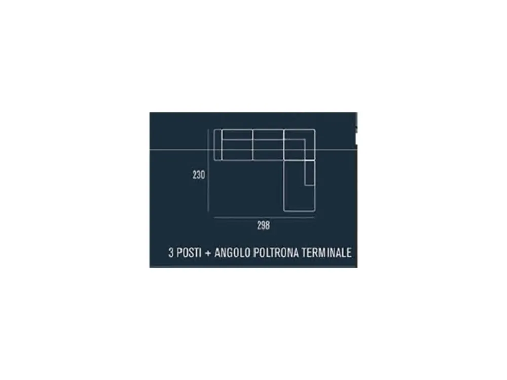 Divano ad angolo a 3 posti con un lato L. 298 cm con due sedute e angolo e l’altro lato L.230 cm con un posto e terminale libero. Sedute in poliuretano espanso elastico ed indeformabile, così come lo schienale ed i braccioli. Rivestimento sintetico in tecnofibra, ecopelle o tessuto con colori a scelta.