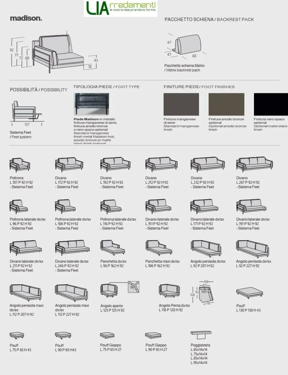 Divano con penisola Madison di Samoa: da cm. 267×162 ,(poggiatesta e sistema Feet-piedi esclusi) il costo è calcolato con un tessuto in cat. A .