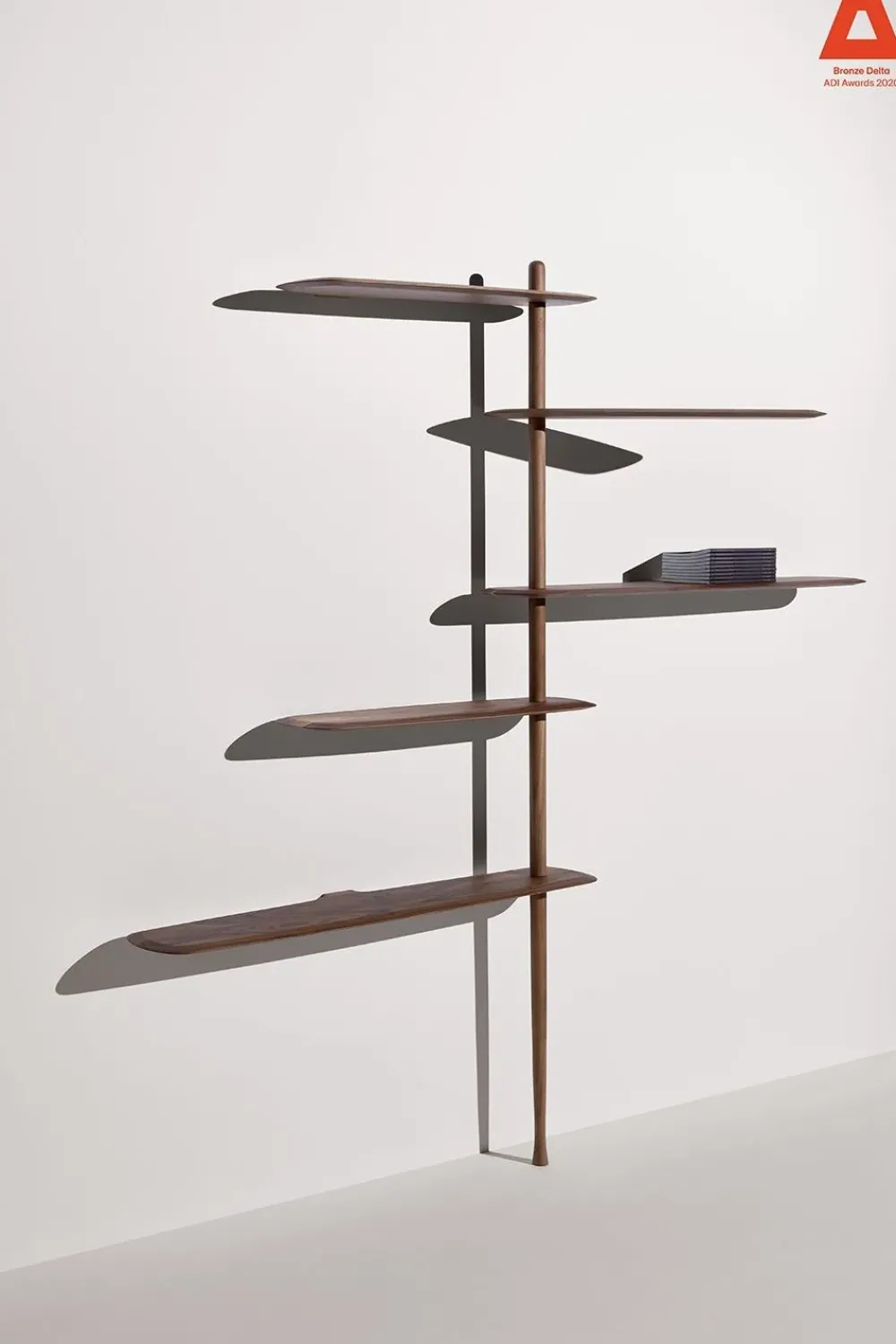 L’insieme si sostiene grazie a un asse centrale su cui s’installano scaffali di forme diverse, fissi a parete o liberi, dotati di struttura rigida per dare dinamismo.