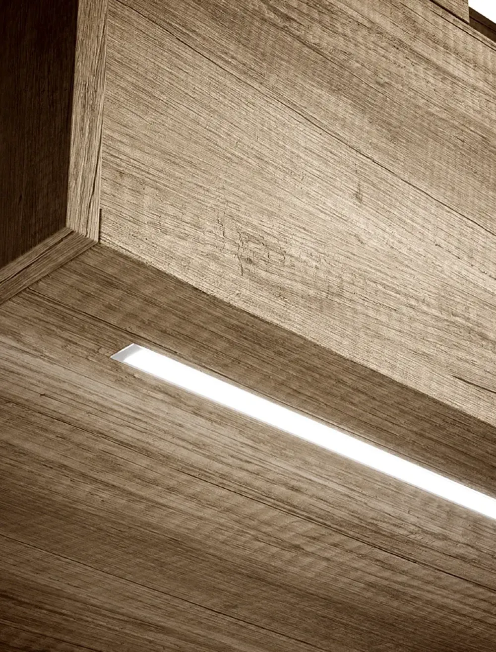 Il monoblocco della collezione Lume puo’ essere predisposto anche per l’illuminazione. I vani a giorno ed il fondo del mobile possono essere illuminati con impianti luce Led 4000K.
