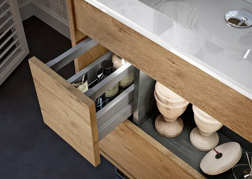 Lume ottimizza gli spazi utilizzando un sifone dall’ingombro ridotto che lascia il cassetto intero, senza foro per il passaggio dello scarico e lo rende organizzabile fino all’ultimo centimetro grazie ai divisori in legno Gim.
