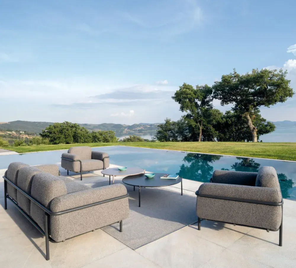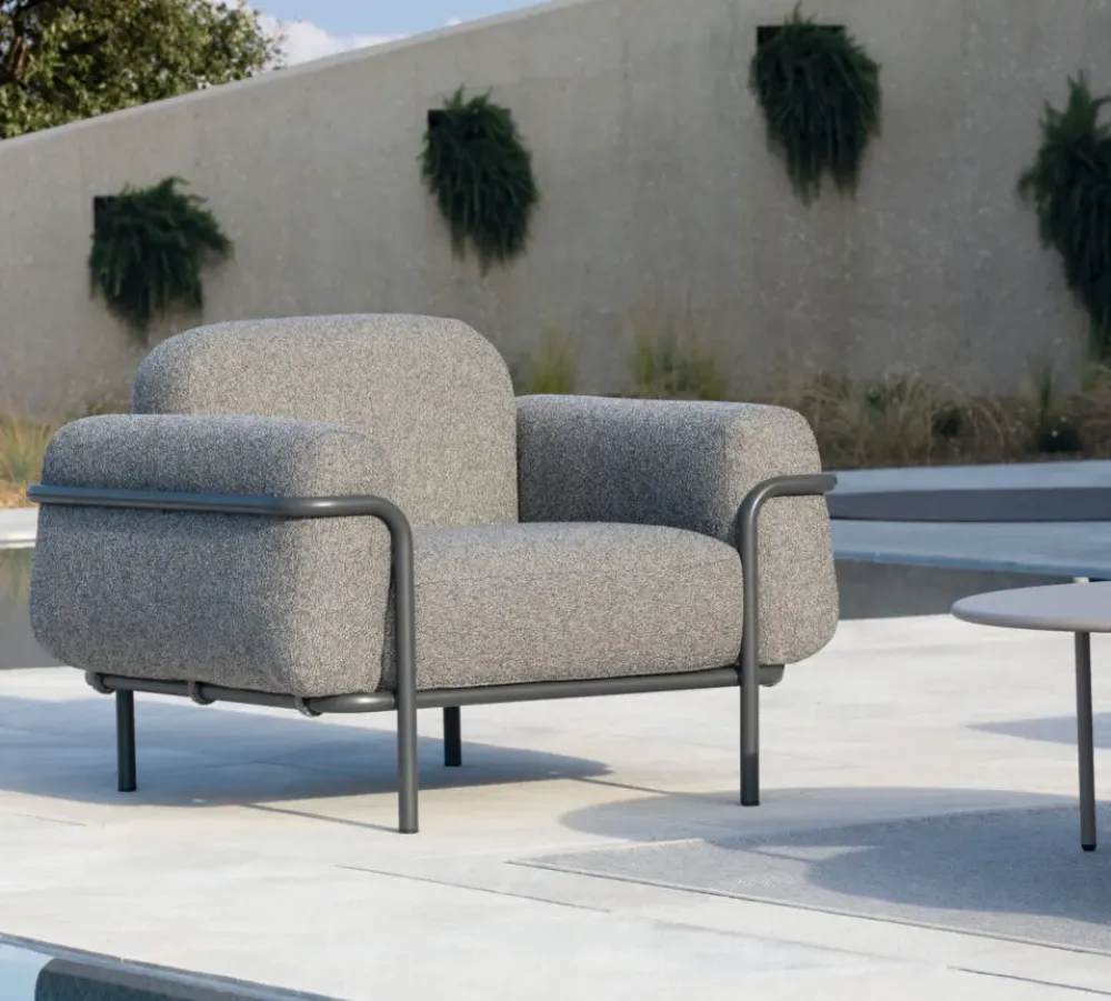 Ideale in giardino o in terrazzo, a bordo piscina o in un portico, Huso è la collezione perfetta per chi punta su un arredo sobrio ed elegante capace di regalare un accento di attualità e freschezza a qualsiasi contesto.The Huso lounge set has solid lines, rounded corners and, as the name suggests, seems to welcome you as in an embrace. The large seats and soft profiles, highlighted by a clean geometric structure, design spaces with contemporary charm. The Huso line consists of a three-seater sofa and an armchair with comfortable armrests. It is a perfect match for a garden or a terrace, by the pool or in a porch. It is also suitable for those who prefer a sober and elegant furniture style with a modern and fresh touch in any space.