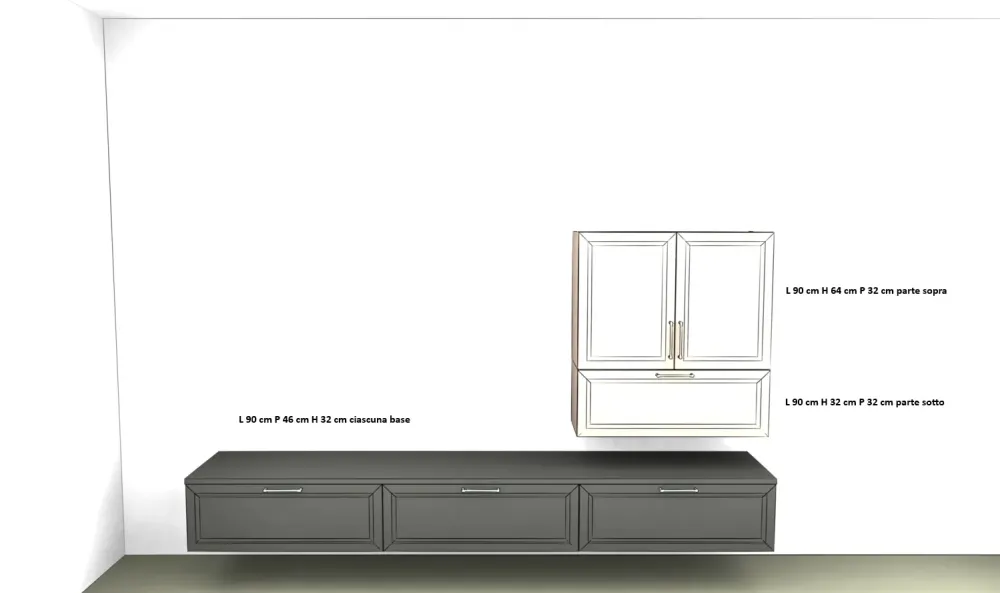 Pensile da L 90 cm H 32 cm P 32 cm con anta a ribalta + elemento da L 90 cm h 64 cm P 32 cm.