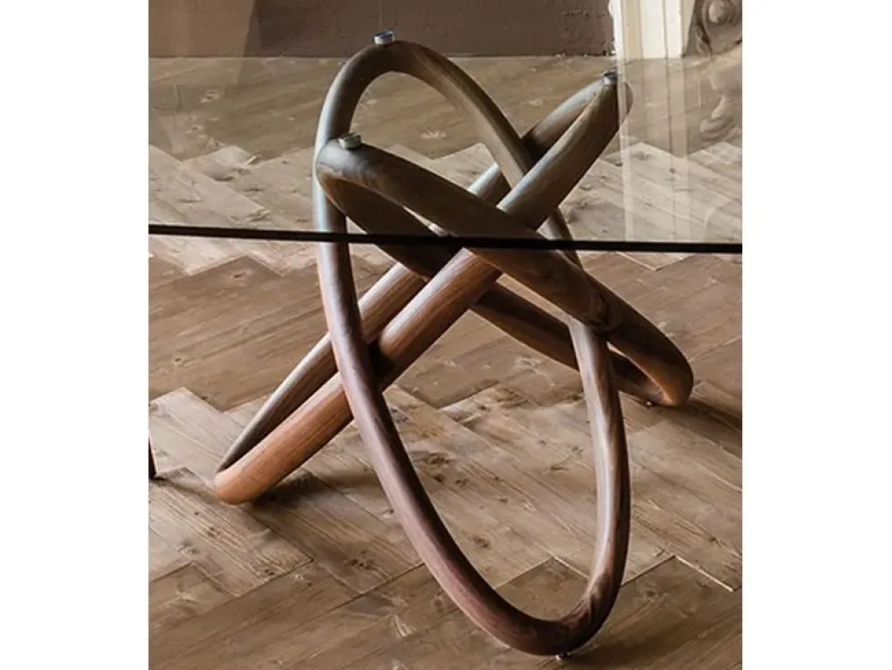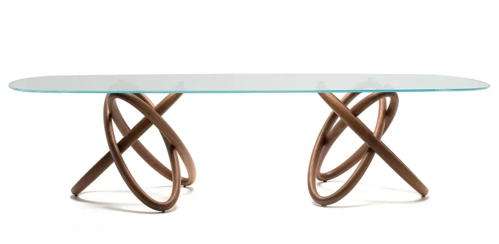 Tavolo con base in massello di noce Canaletto. Piano con piastre in cristallo 15mm trasparente. Design by Andrea Lucatello L300x120x75h cm. CON CRISTALLO TRASPARENTE.