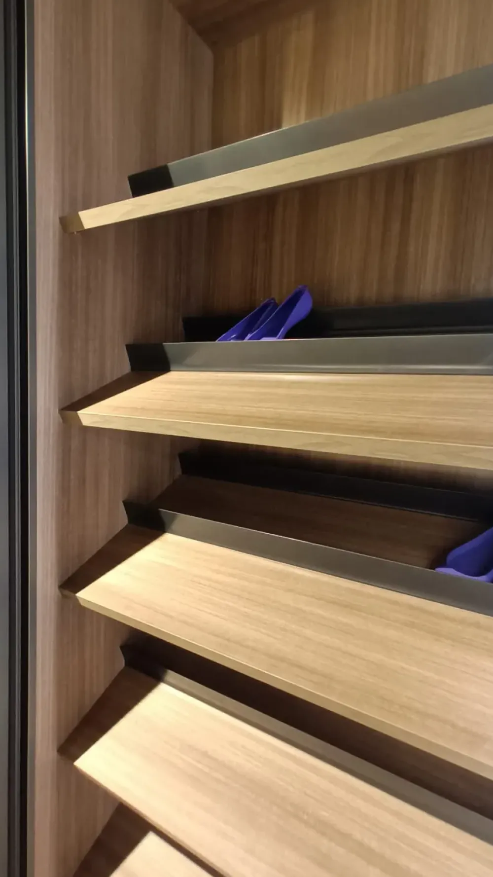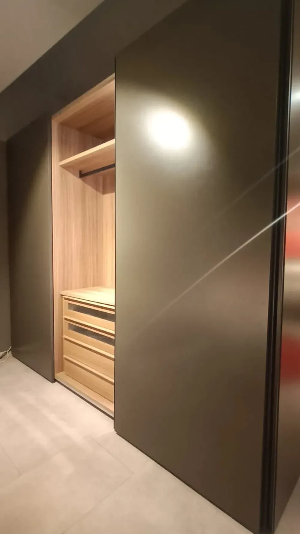 Armadio a tre ante scorrevoli, attrezzato internamente con un vano completamente adibito a scarpiera, una cassettiera interna, 5 ripiani totali , di cui 3 estraibili, e 2 tubi appenderia.