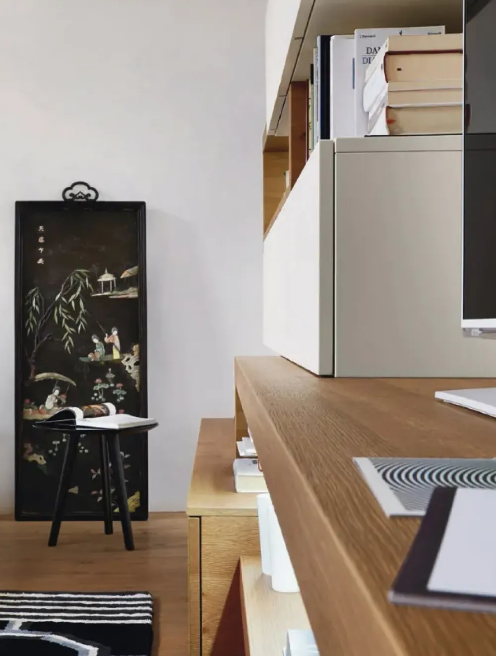Il soggiorno protagonista di questa proposta davvero vantaggiosa è costruito in laccato opaco: la robustezza e la modularità strutturale si combinano in modo ottimale con le doti estetiche della finitura, ripresa dai diversi elementi della composizione.