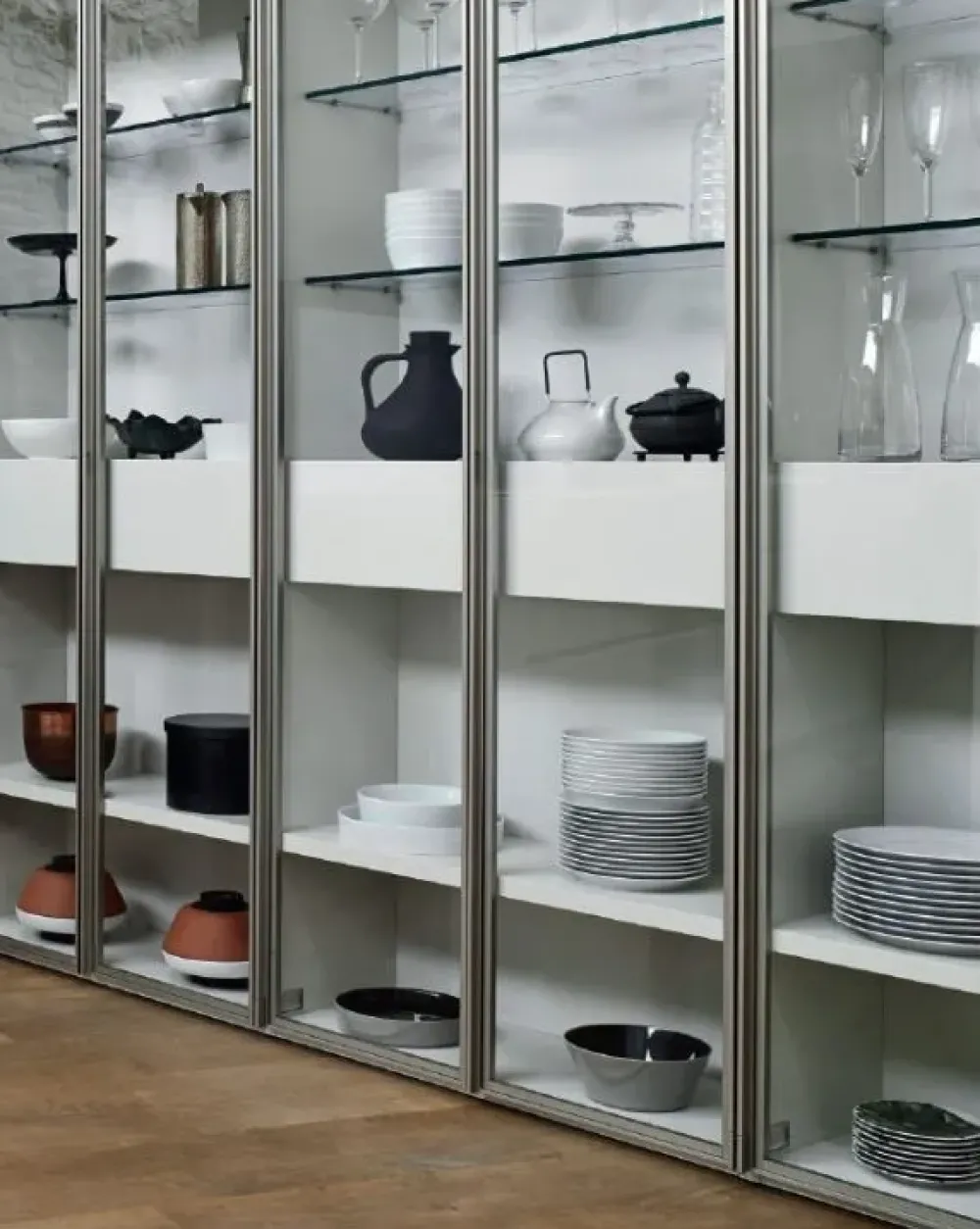 Il soggiorno nell’immagine si compone di diversi mobili ed elementi accessori, impreziositi dalla finitura in laccato opaco per essere sempre sempre resistenti e di gran classe.