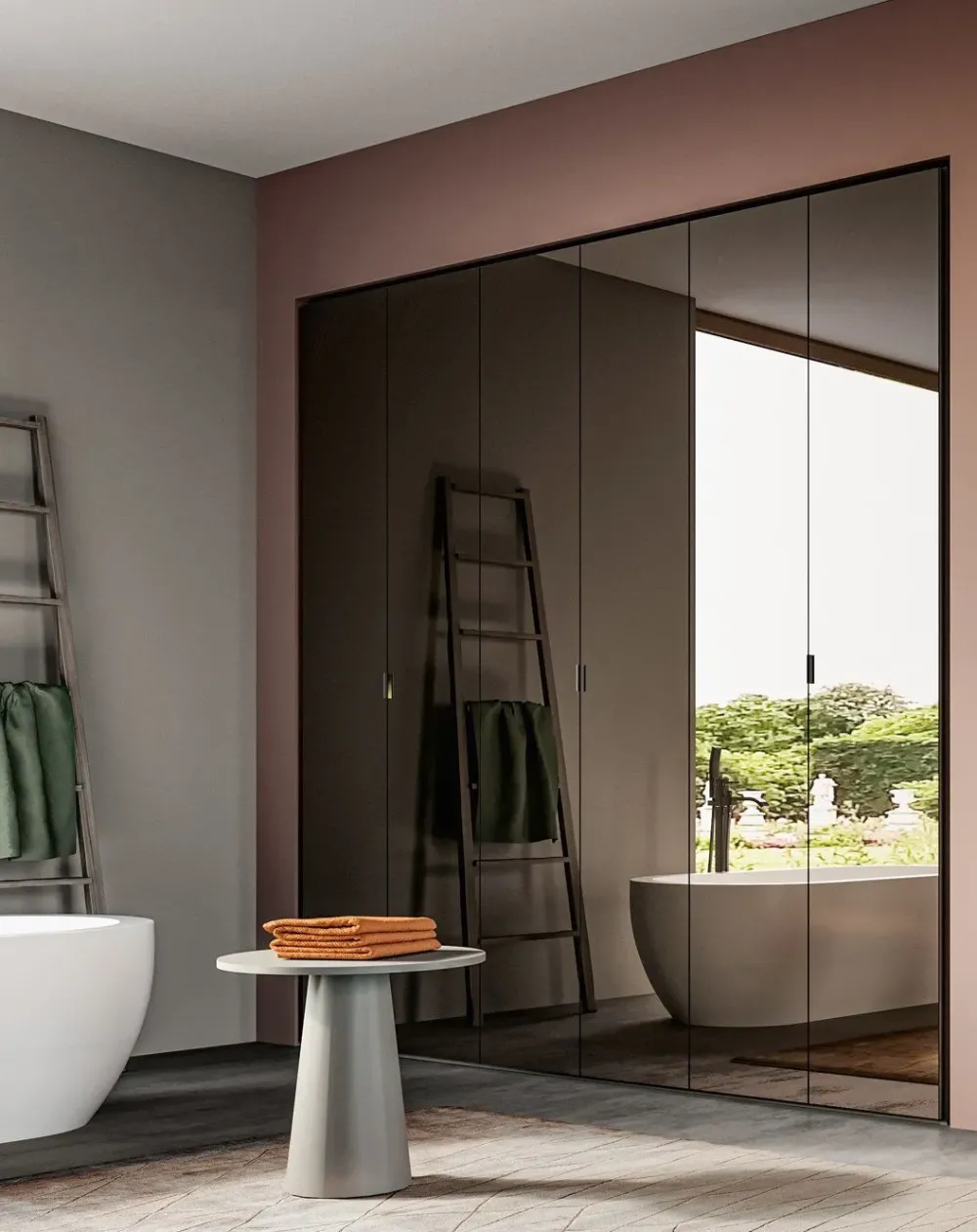 Le scocche sono disponibili in essenza, colore eco e materia, mentre i frontali sono specchiati. Su richiesta, questo modello è disponibile anche senza ante specchiate o solo con ante centrali specchiate