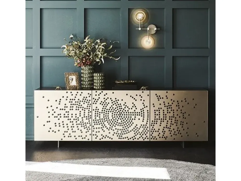 Voyager è una madia a 2 o 3 ante in legno laccato moka lucido. Le ante sono in cristallo specchiato bronzo con decori in rilievo in colore oro. I piedini sono in acciaio inox lucido, verniciati grafite opaco. I ripiani interni sono in cristallo trasparente.