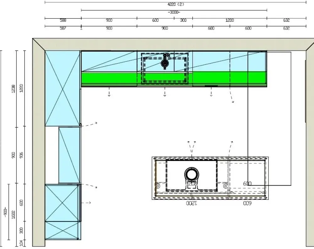- Include tutti gli elettrodomestici necessari per una cucina completa: cappa a isola, forno multifunzione, forno microonde ad incasso, frigorifero libero posizionamento, lavastoviglie con comandi a scomparsa, lavello in resina, piano cottura in induzione e rubinetteria miscelatore.