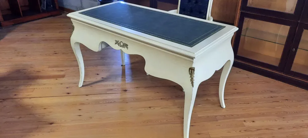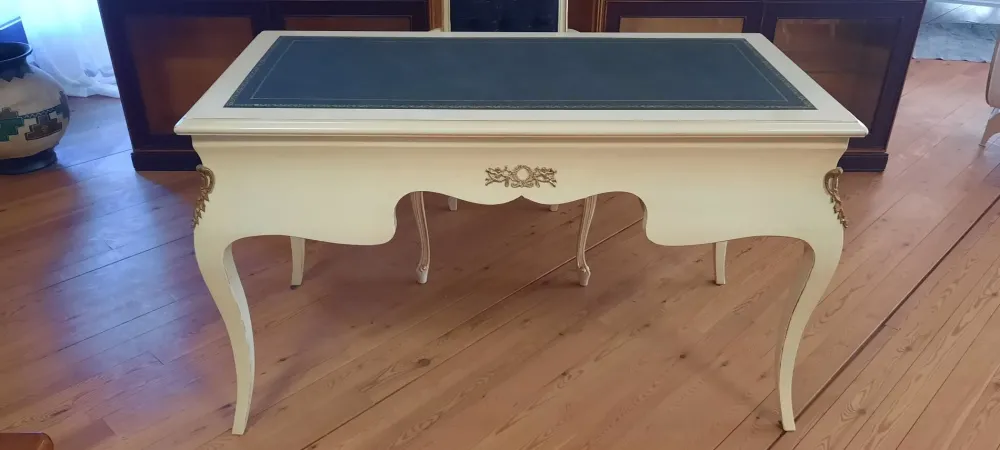 Scrivania artigianale sagomata e impreziosita da fregi di ottone e dal piano in vera pelle con decorazioni dorate sul perimetro , 5 cassetti frontali , finitura crema con effetto leggermente anticato.