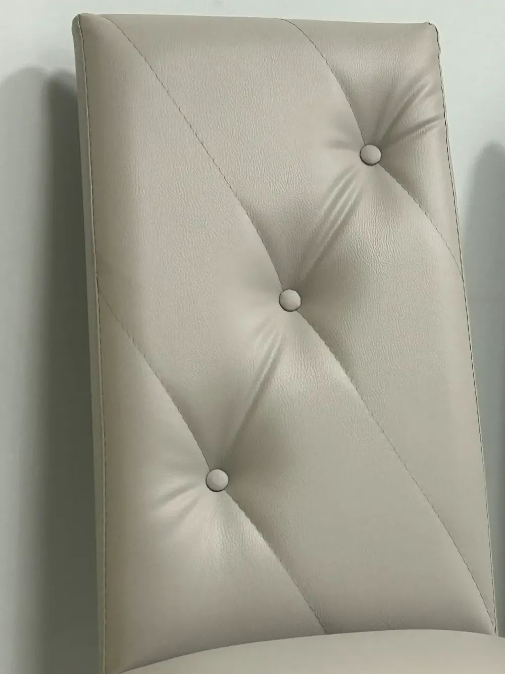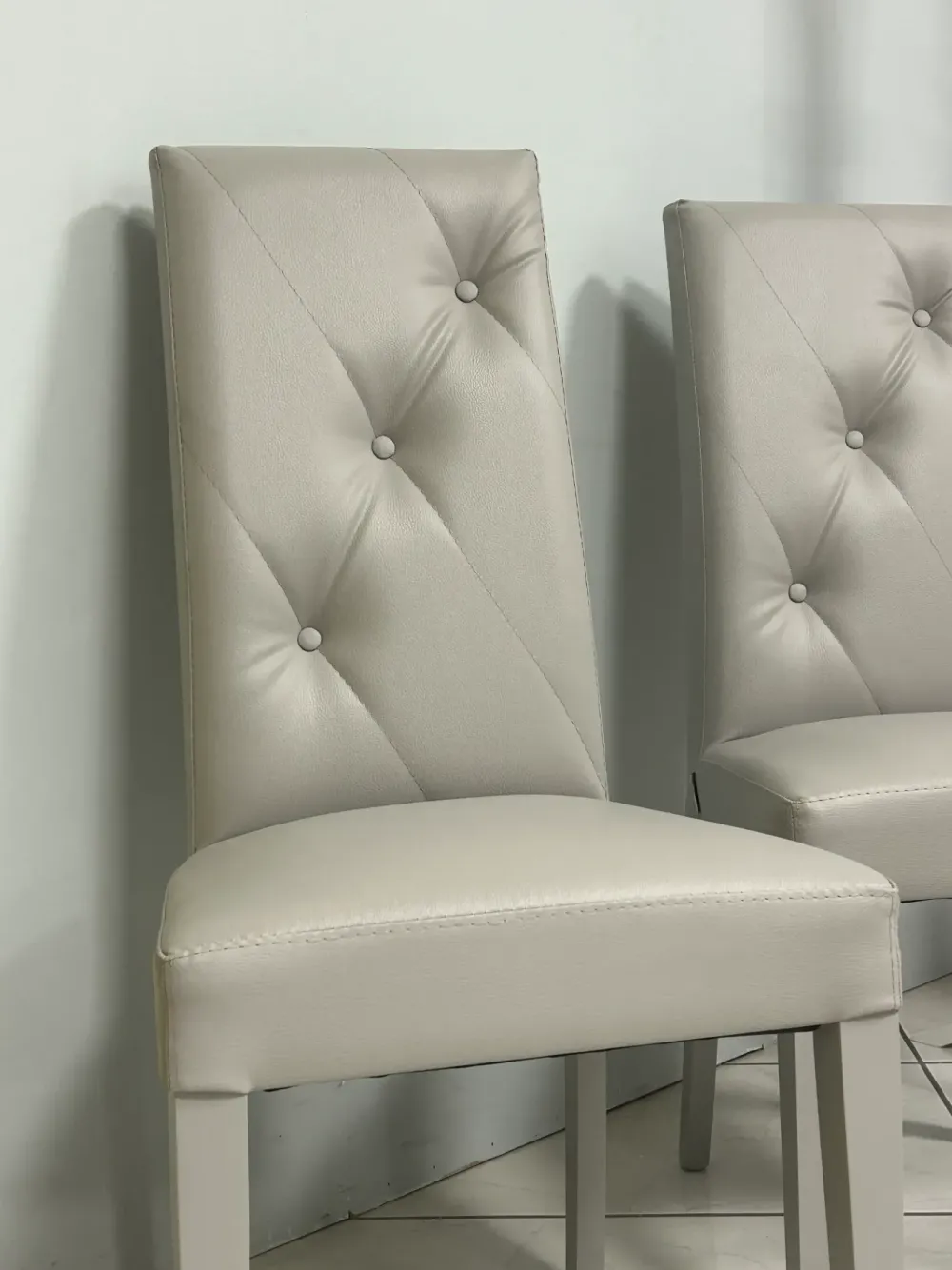 Sedia con struttura in legno laccato e seduta morbida imbottita trapuntata in ecopelle.