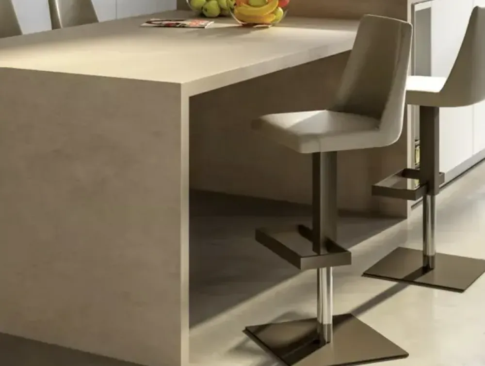 DALLAS è uno sgabello con meccanismo a gas regolabile in altezza. Seduta in eco pelle. Struttura e poggiapiedi in metallo verniciato grafite o bronzo. Base e poggiapiedi quadro.
