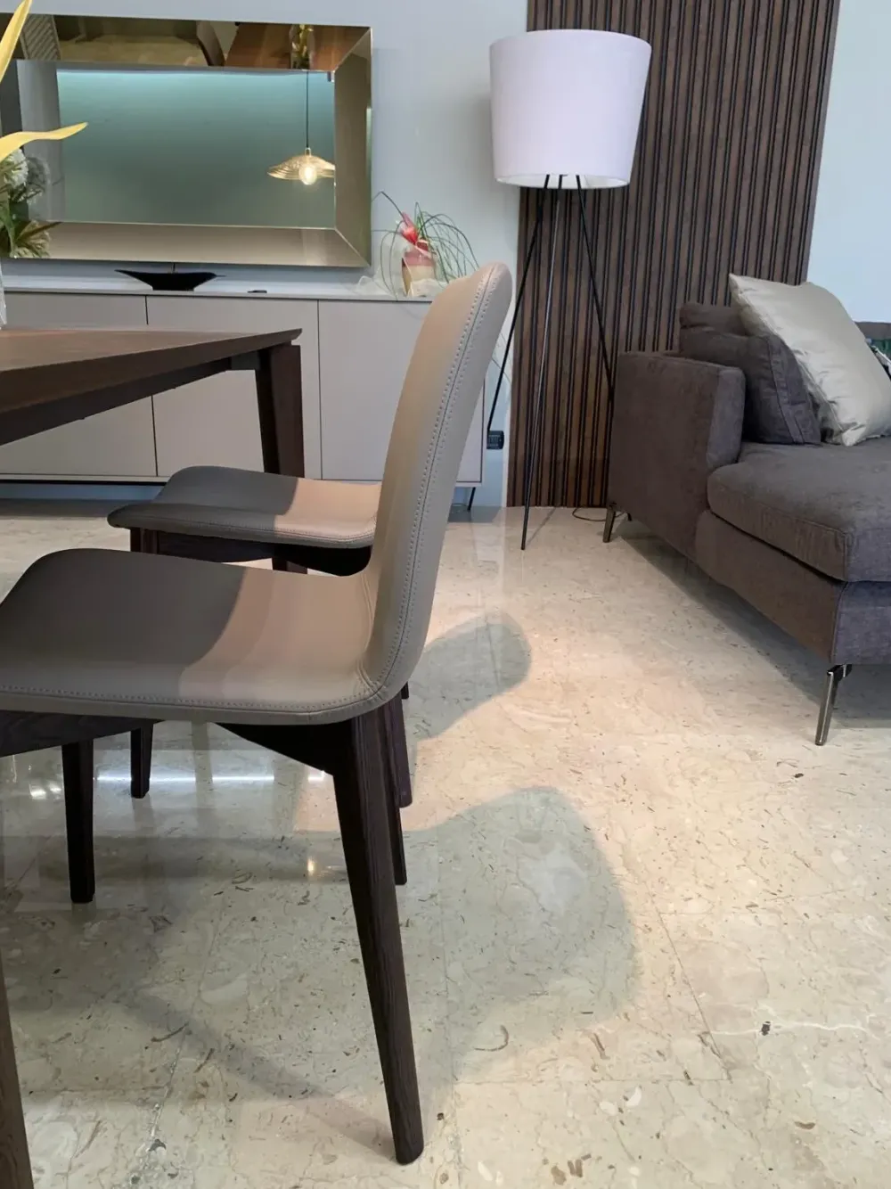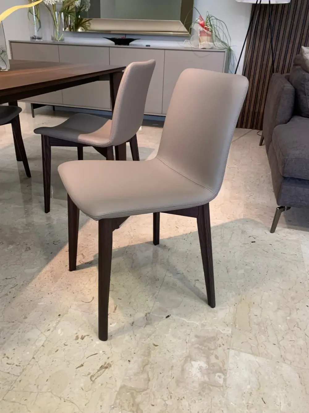 Sedia con struttura in legno e seduta in ecopelle tortora, il prezzo è riferito al kit 4 sedie