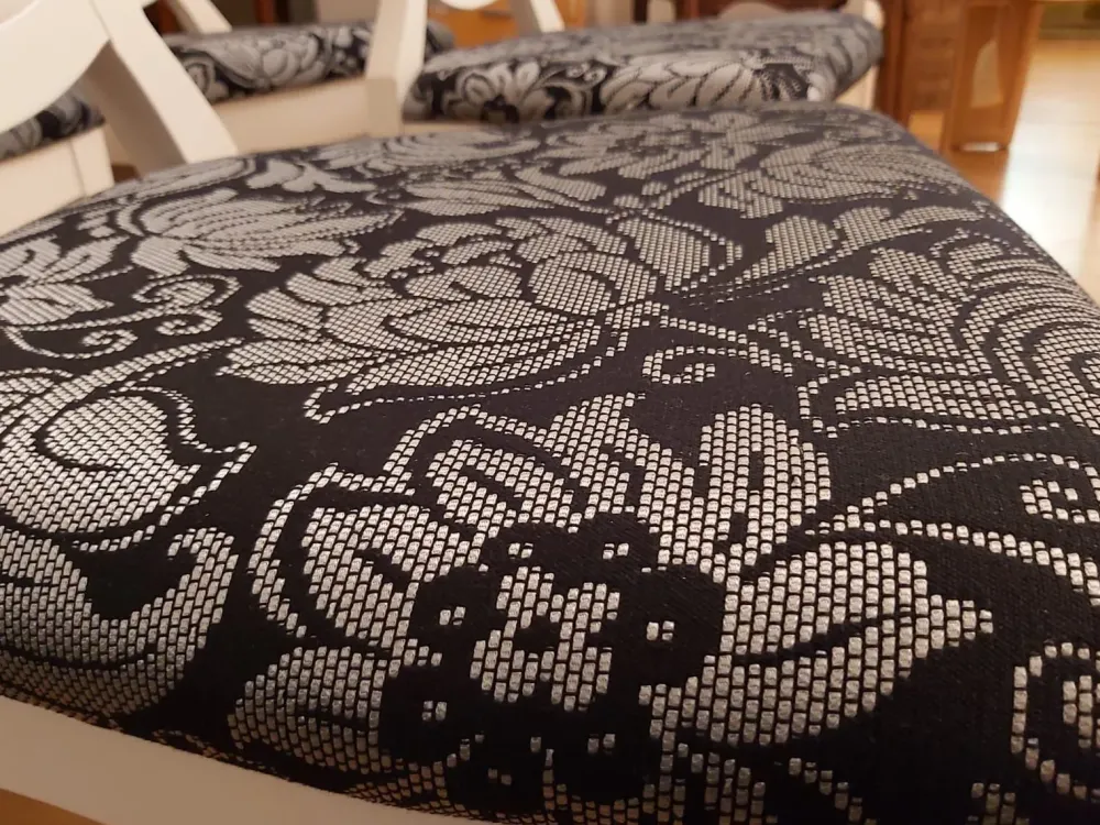 Struttura in laccato bianco e seduta in tessuto blu e fiori argento. La particolarità della sedia Magnolia sono la forma a cerchio vuoto internamente dello schienale e la seduta ben profonda che arriva fino a 47 cm. Elegante e sinuosa nella forma quanto nella presenza floreale nel tessuto.