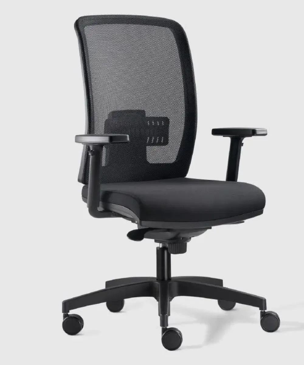 Poltrona operativa Schienale in rete, regolabile in altezza Supporto lombare regolabile in altezza e profondità Sedile imbottito in resina espansa ignifuga Braccioli regolabili in altezza con struttura in nylon nero con pad in PU Meccanismo sincronizzato, bloccabile in 5 posizioni, nero Base a 5 razze Ø 700 mm in nylon nero Set ruote maxi autofrenanti in PP nero Dimensioni L65 P55 H106/120 Certificata UNI EN 1335 A Conformità CAM Omologazione CLASSE 1IM Tessuto ignifugo MR6651 Colore nero Rete RV0651 colore nero.