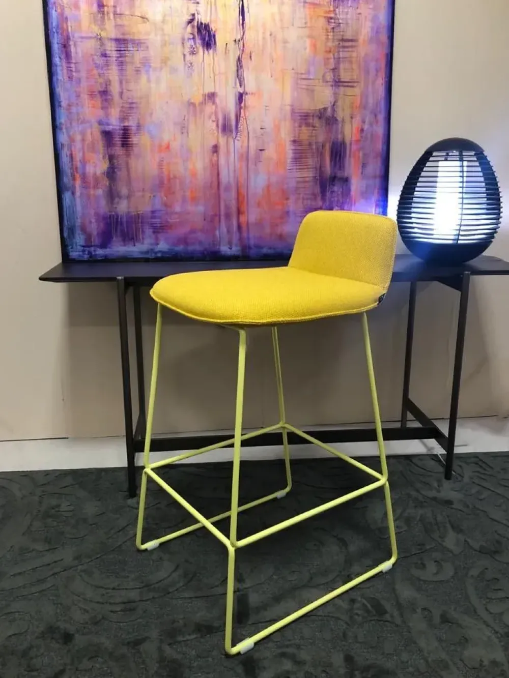 Sgabello con struttura in metallo a colore giallo, e seduta in tessuto a colore. Dim. seduta 42×42 cm, H da terra 80cm