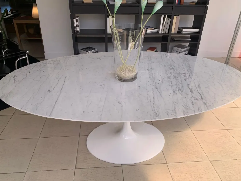 Top in marmo bianco Carrara e base in fusione di alluminio laccato lucido col. bianco