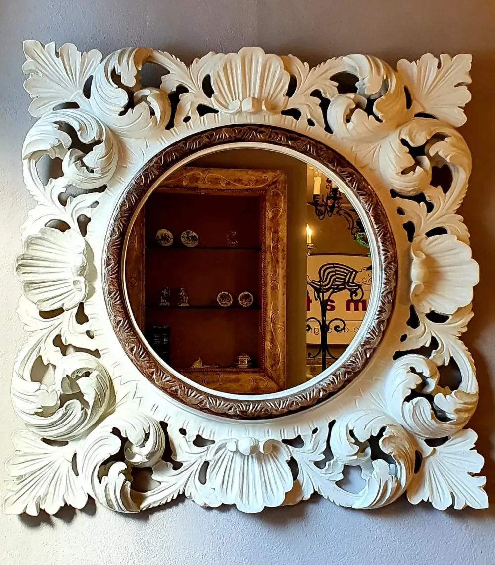 - Cosa rende speciale questo specchio?La sua unicità deriva dall’artigianalità italiana, con lavorazioni manuali, intagli dettagliati e una cura maniacale per i particolari che lo rendono un pezzo da collezione.
