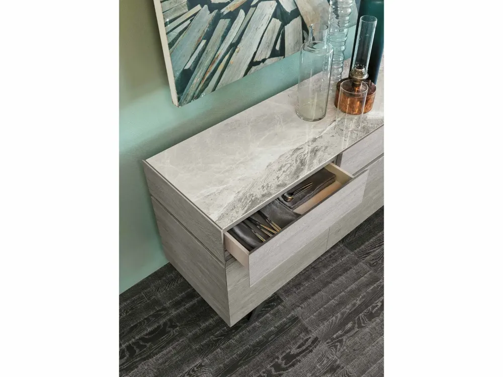 Quando i dettagli fanno la differenza: lavorazione a 45° sul bordo superiore e sul lato inferiore, tre cassetti ad estrazione totale, con sistemi di chiusura assistita che montano cerniere che garantiscono un’apertura dell’anta fino a 165°, laminati di nuova generazione con poro registro che li rendono del tutto identici al legno ed infine vena a correre su tutta la lunghezza della madia, questa è ELECTA.