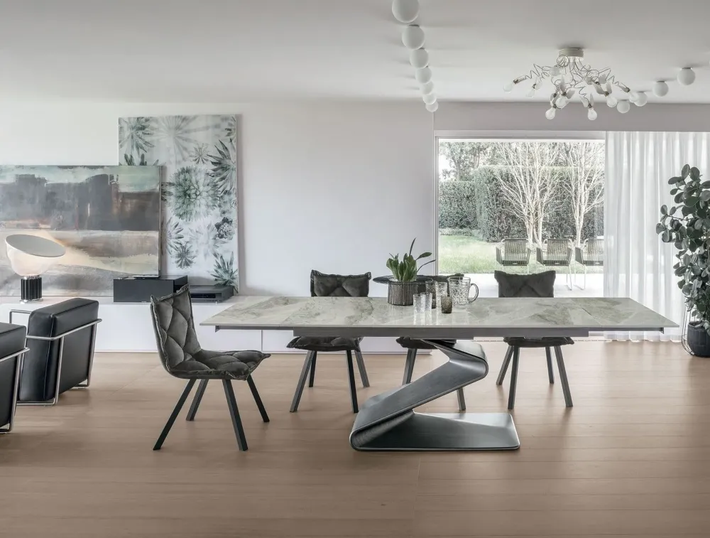 - L’offerta è per un tavolo rettangolare allungabile di cm 180×90 allungato cm 270 con piano in gres Calacatta opaco o Carrara lucido.