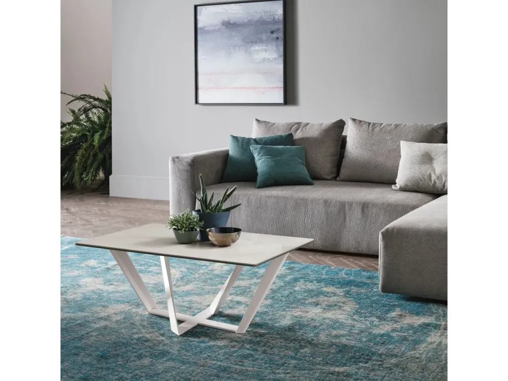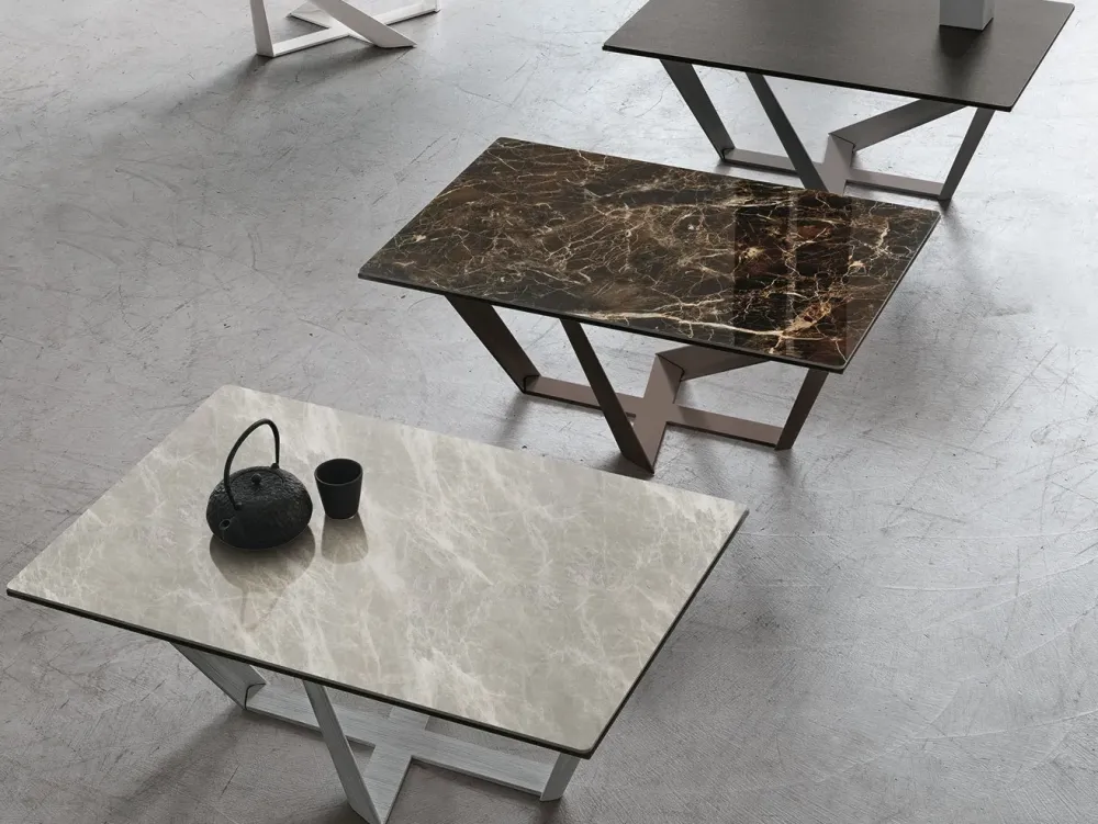 Preziose sono anche le rifiniture della struttura, in bianco, grafite, marrone vintage o metallo spazzolato. Per gli amanti dei coordinati, il tavolino è perfettamente abbinabile al basamento del tavolo che è disponibile in diverse misure e con diversi tipi di piano, il gres, al laminato e anche in legno impiallacciato.