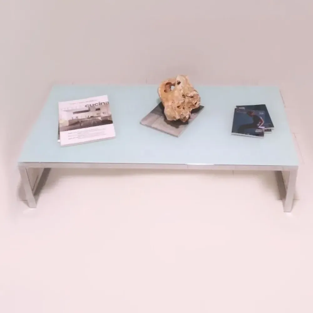 Il tavolino , è composto da un piano in vetro serigrafato bianco e la struttura è in finitura cromata .