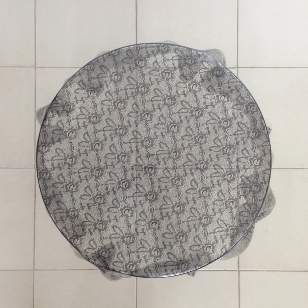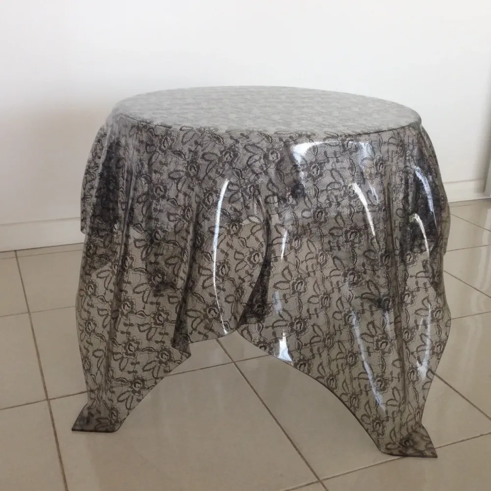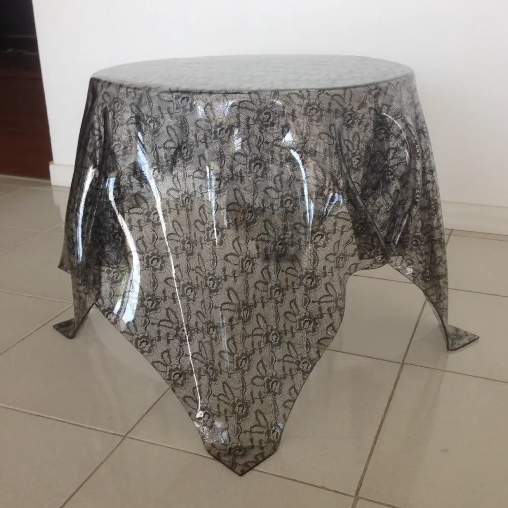 Tavolino in meteriale plastico termoformato nei colori MADREPERLA GRIGIO e PIZZO NERO (vero pizzo fuso nel materiale). Dimensioni: cm 60×60, altezza cm 46,diametro piano cm 48.