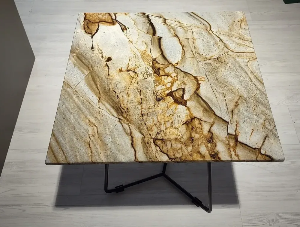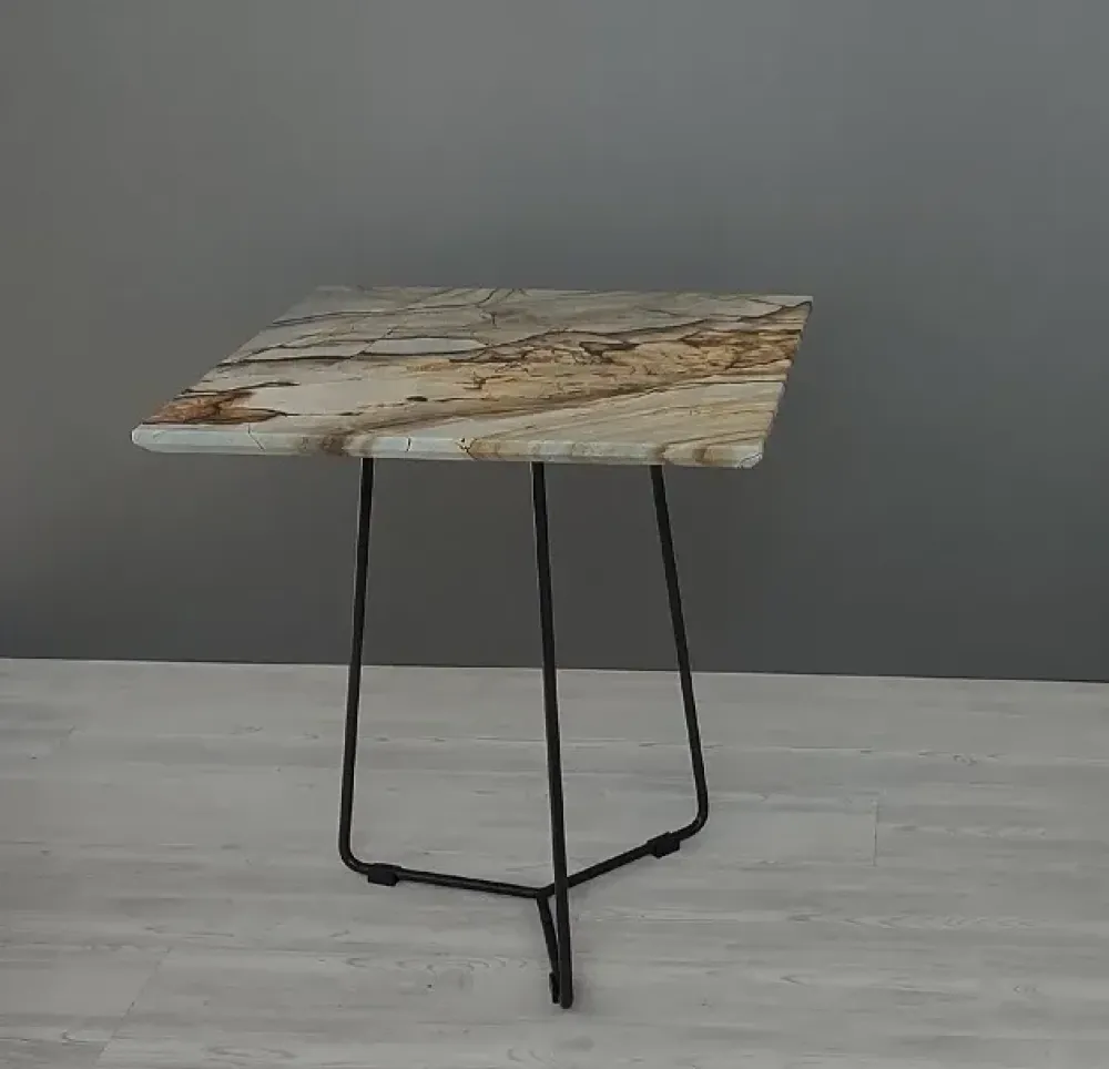 Tavolino quadrato mod. Kevin della ditta Ditre Italia con piano in marmo Spiderman e basamento in metallo verniciato antracite.