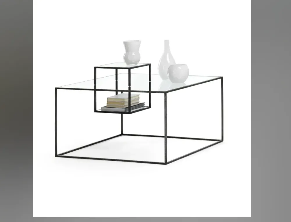 Tavolino con struttura in metallo verniciato nero e piani in cristallo temperato. 90 x 90 h.55 cm .