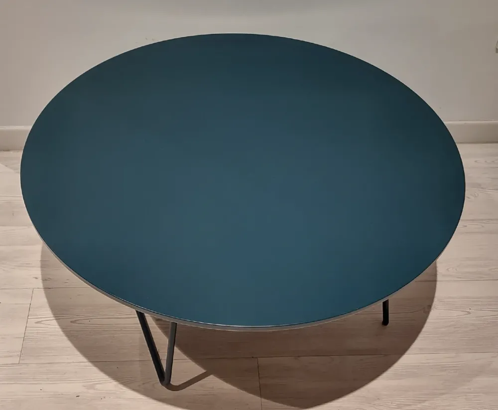 Tavolino rotondo mod. Orbis della ditta Novamobili con piano laccato opaco Cascata e gambe in tinta.