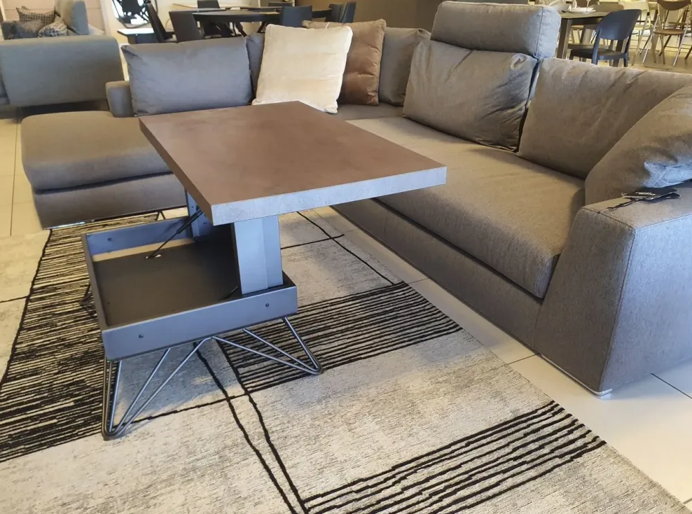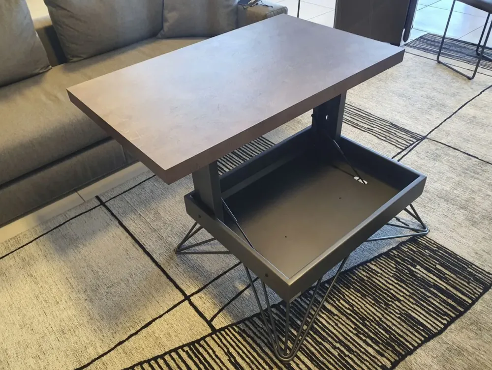 È un’ottima soluzione salvaspazio grazie al meccanismo di sollevamento a gas auto frenante in quanto il piano passa da un’altezza base di cm H.32 per arrivare ad altezza 64 cm, comodo per mangiare o per appoggio pc