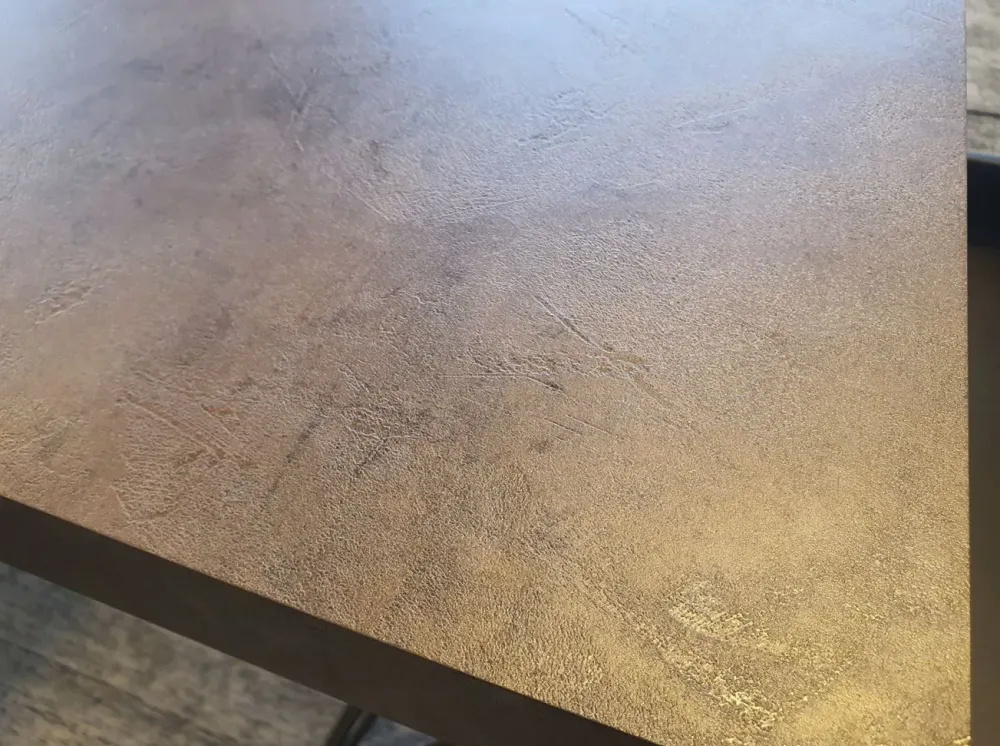 La struttura e le gambe sono in metallo color grafite mentre in piano è in eco-legno CORTEN, finitura che ricorda il metallo effetto ruggine.
