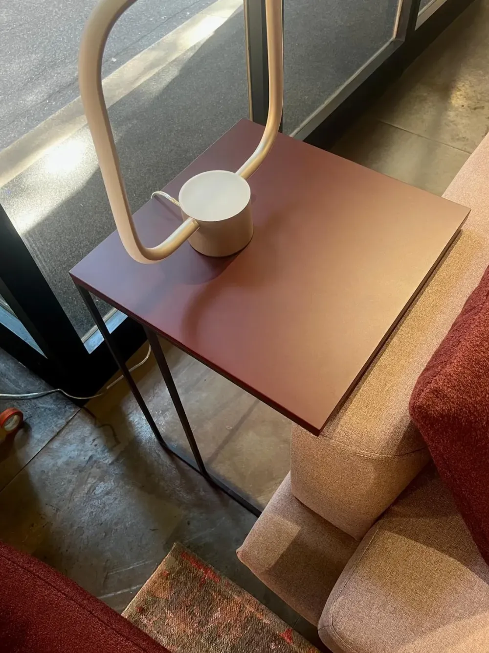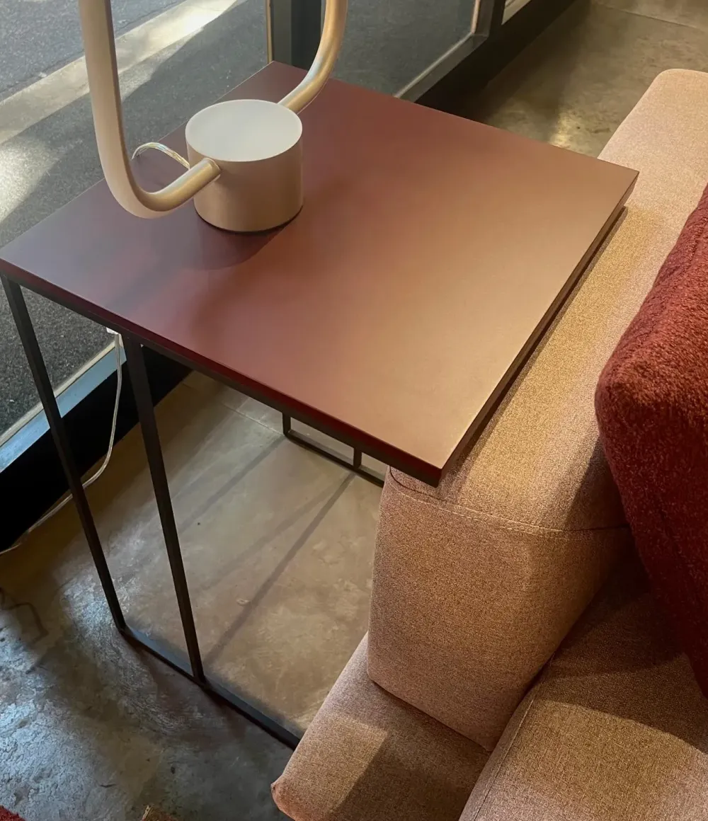Tavolino Nexus, bronzo vintage. Piano laccato rosso porpora 061