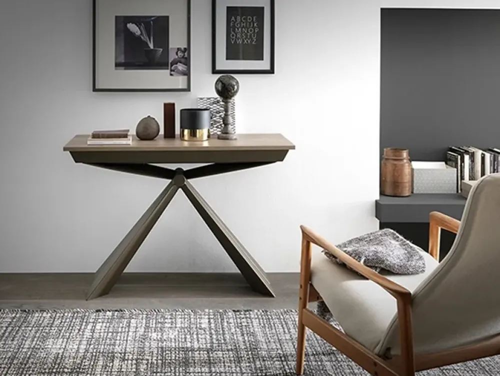 Consolle estensibile, struttura in metallo, meccanismo telescopico in alluminio, piano in nobilitato, 3 allunghe. Gambe centrali di supporto in tinta con la struttura. Finitura base: verniciato bronzo goffrato Finitura piano: nobilitato rovere Disponibile in altri colore e materiali Dimensioni chiuso: L 110 x p 45 x H 75 cm Dimensioni aperto: L 110 x p 95/145/195 x H 75 cm
