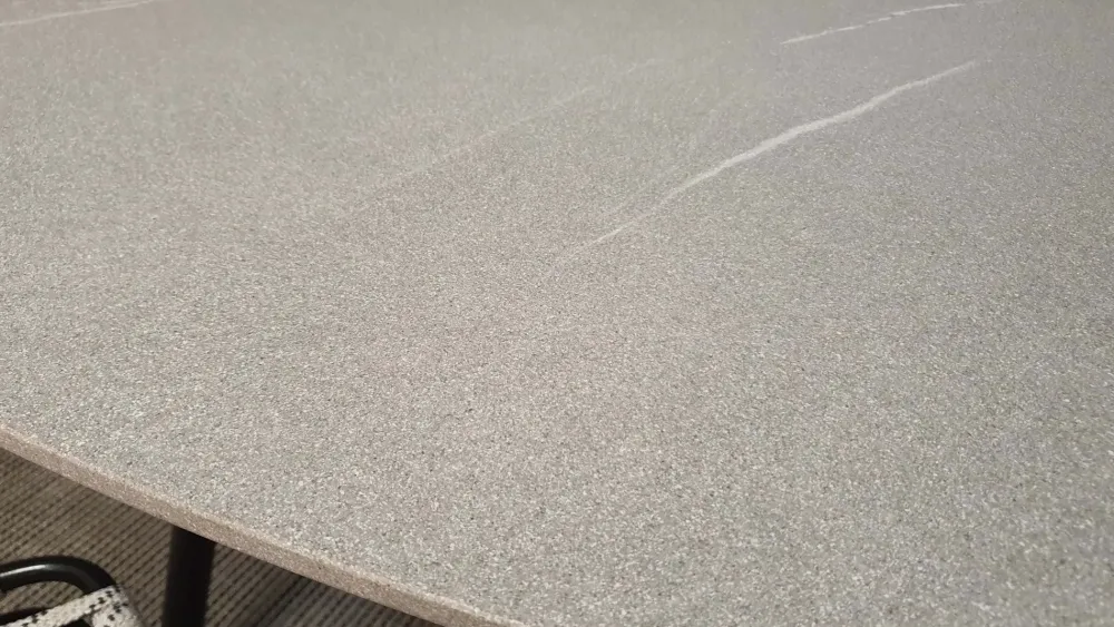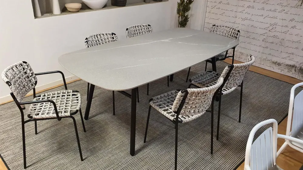 Gambe in metallo finitura NERO OPACO e piano in CERAMICA PIETRA PIASENTINA. Il tavolo è stato studiato appositamente per il giardino in quanto i materiali impiegati sono idrorepellenti.
