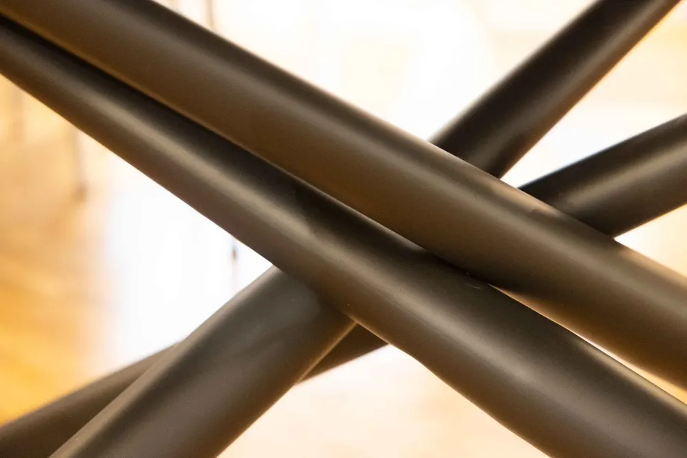 STRUTTURA IN ACCIAIO VERNICIATO A POLVERE APOSSIDICA. PIANO IN CERAMICA 5 MM CON SUPPORTO IN VETRO TEMPERATO 8 MM