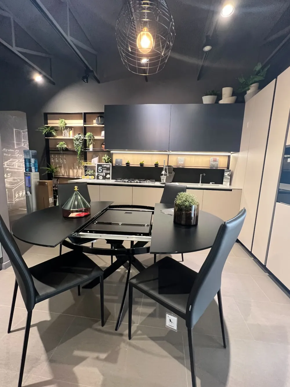 TAVOLO ROTONDO ALLUNGABILE CON VETRO VELVET ANTIGRAFFIO NERO OPACO E STRUTTURA IN NERO PROFONDO LUCIDO.